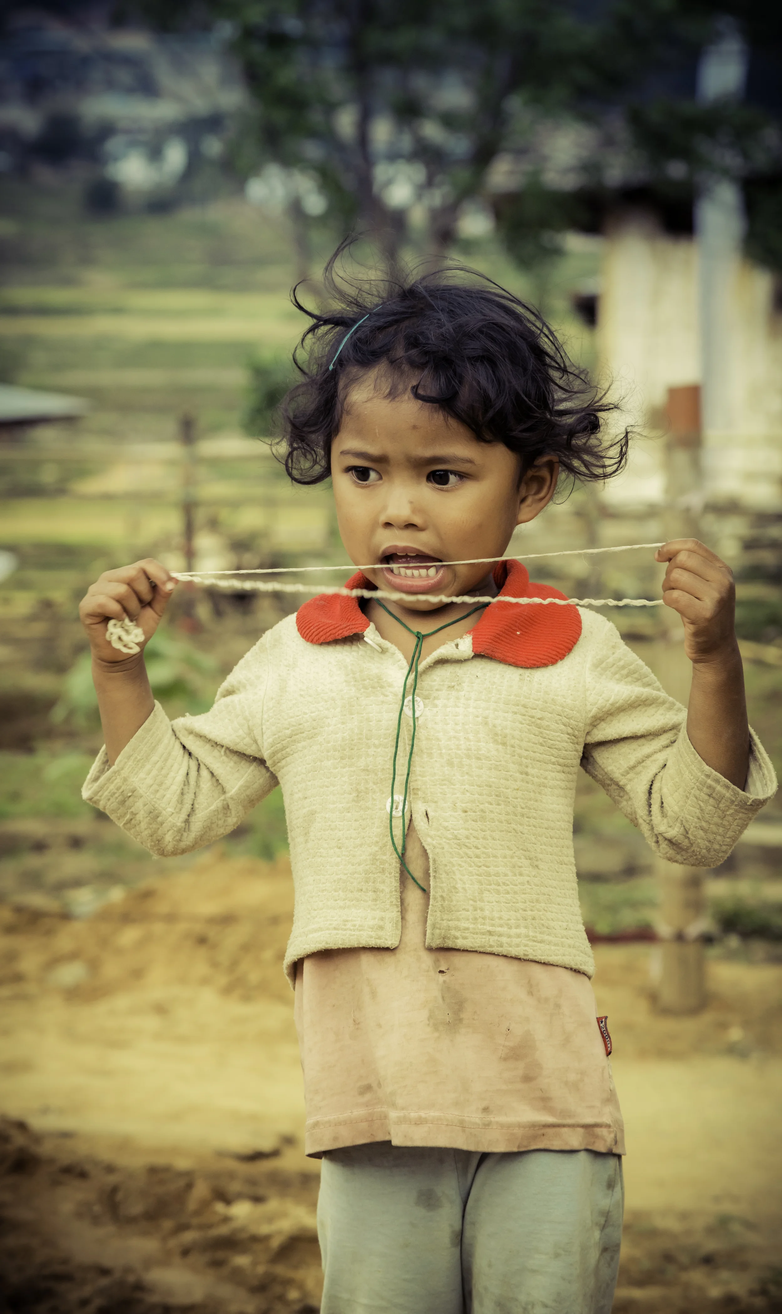 Girl in Bhutan playing, but looking a bit apprehensive.