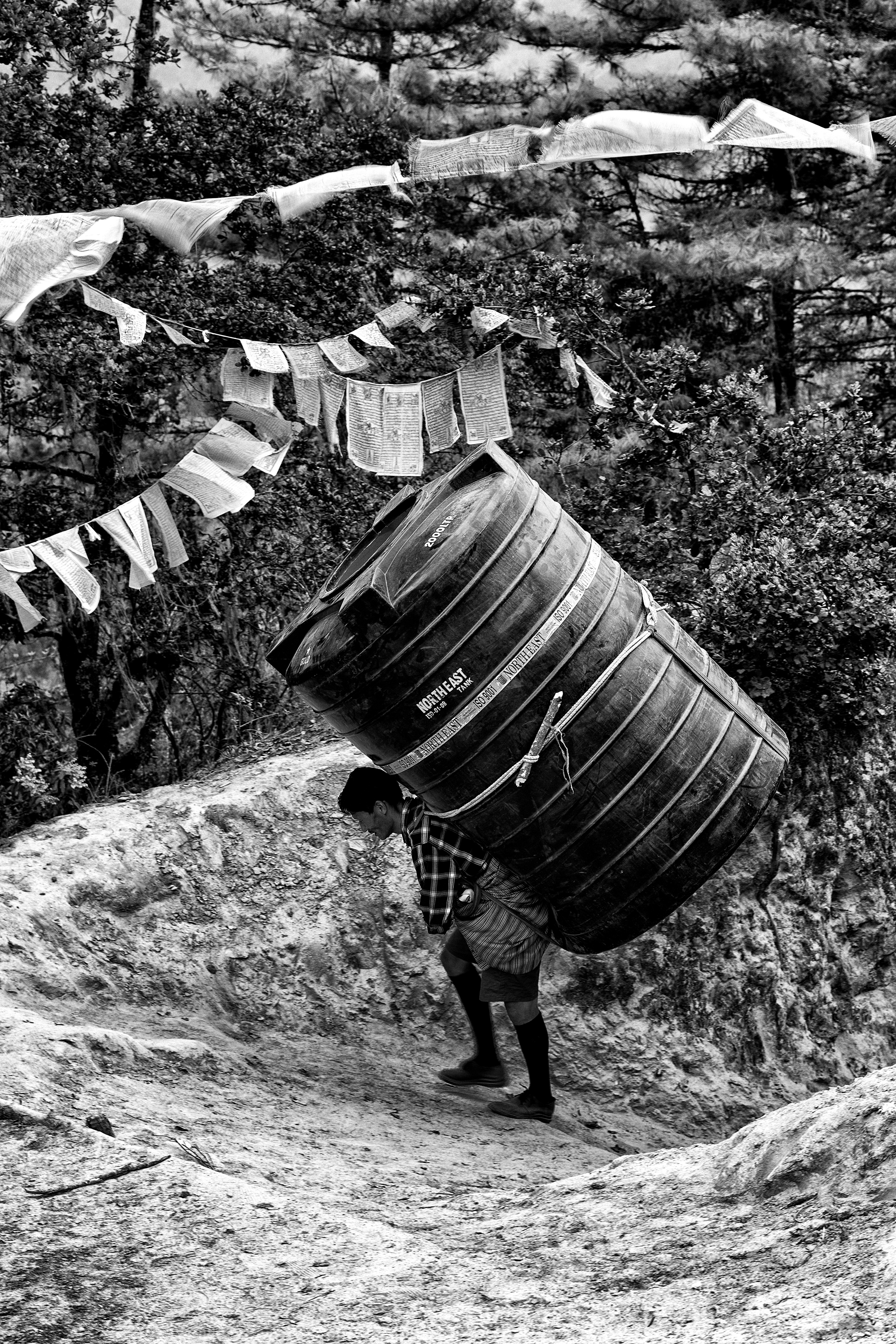 I can only presume (hope) that the container on this guy's back is empty. Even if it's empty, it's still probably pretty heavy, and must be super uncomfortable to lug all the way up. As back-breaking at this work looks, keep in mind that the people of Bhutan are some of the happiest people in the world and continue to measure their Gross National Happiness in efforts to maximize their happiness. If nothing else, I hope this photo helps to provide a greater appreciation for the food and drinks you come upon at the rest stops high up in the mountains, when you might occasionally wonder, "how is this stuff here?!?"