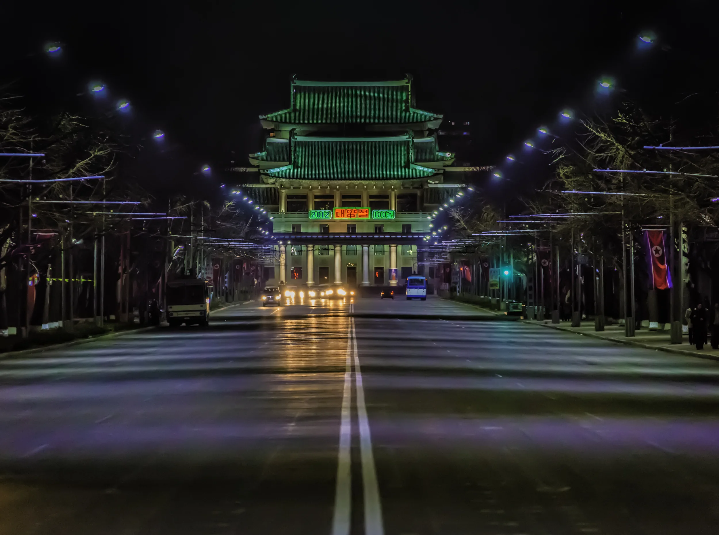 Sungri Street in the heart of the Democratic People's Republic of Korea, lit up at night. The street runs through Pyongyang, directly in front of some famous sites such as Kim Il-sung Square, the headquarters for the Worker's Party of Korea, and as shown here, Pyongyang Grand Theater (not to be confused with East Pyongyang Grand Theater).